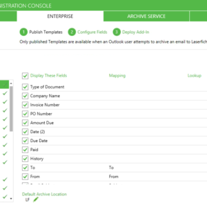 The Admin determines what templates to make available to the user, as well as how to handle field values’ metadata. When the goal with data is consistency, user input of values introduces the possibility of error. Within the EMAC, the Admin is not only able to define which OutLook email properties associate with what template fields, but also permits assigning a lookup attribute to a field. By connecting template fields to CRMs, Purchasing systems, HR systems, for example, key fields will automatically be populated with accepted values according to a company’s System of Record—not an input field.